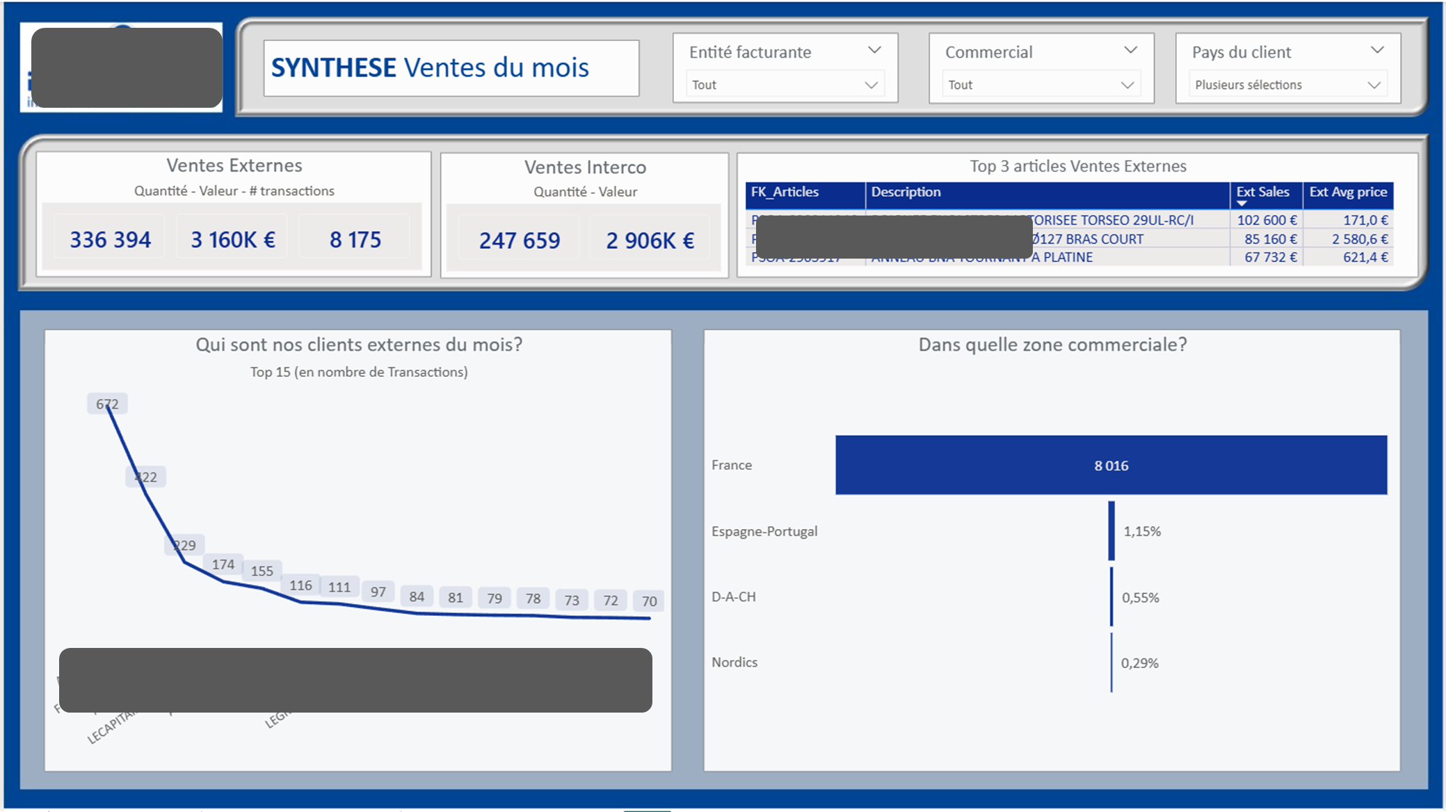 Synthétiser l’information de façon claire pour une utilisation facile pour tous les métiers, et permettre à la direction de voir d’un coup d’œil les performances par géographie, par vendeur, article, client…